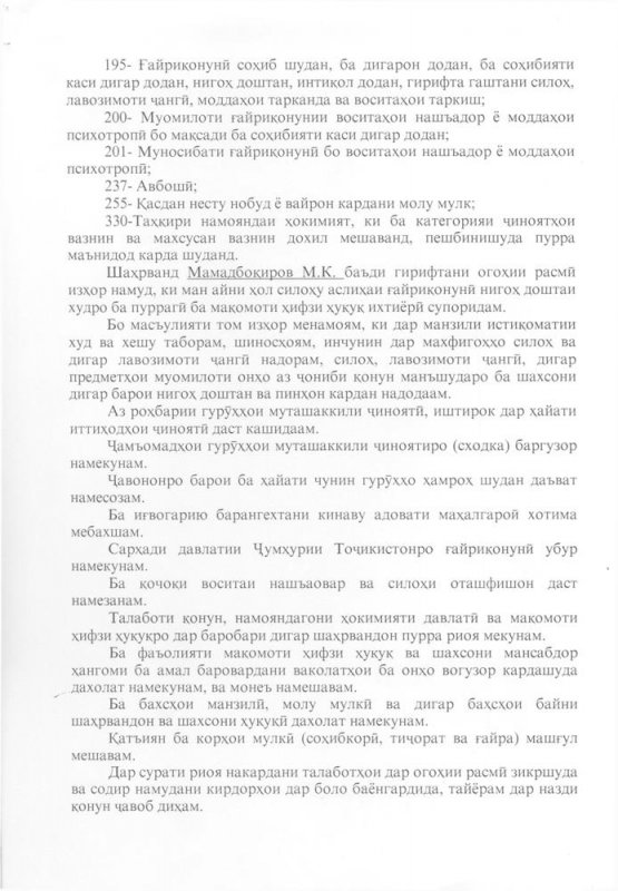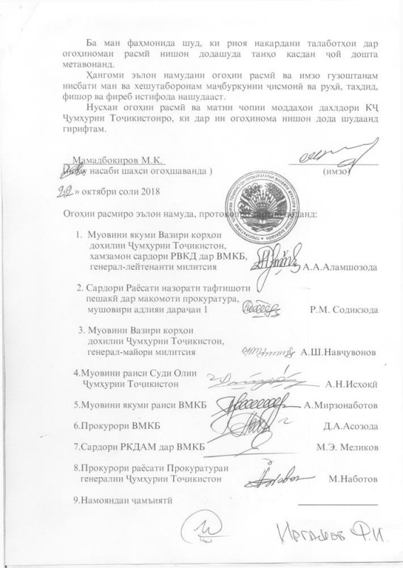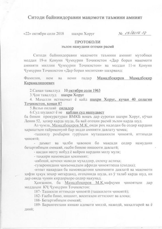 Тибқи ин иттилоот,дар қатори саркардаҳои ГМҶ-и шаҳри Хоруғ аз ҷониби Прокуратураи ВМКБ ҶТ нисбат ба Мамадбоқиров Мамадбоқир Карамалишоевич, санаи таваллудаш 15-уми октябри соли 1963, зодаи шаҳри Хоруғ, сокини кӯчаи 40-солагии шаҳри Хоруғ, хонаи 87, бекор, саркардаи ГМҶ-и ш.Хоруғ, низ огоҳии расмӣ эълон шудааст, ки Протоколи номбурда барои хонандагон замима мегардад.